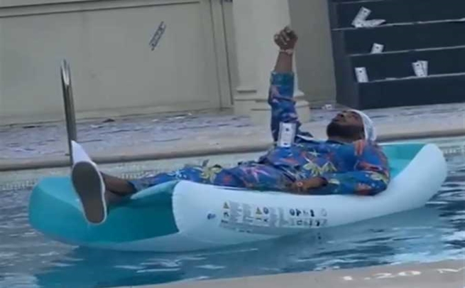 نشر الفنان محمد رمضان، الأربعاء، فيديو من داخل حمام السباحة، وظهر وهو يلقي الكثير من الدولارات في المياه، في إشارة لعدم اكتراثه للمال.