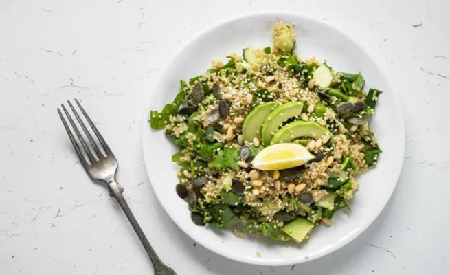 سلطة السبانخ مع الكينوا والأفوكادو وبذور اليقطين