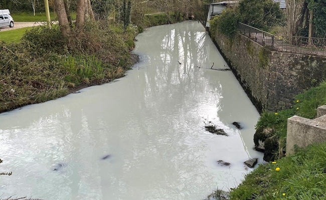 تحول نهر ”دوليس“ في ويلز بالمملكة المتحدة إلى اللون الأبيض بالكامل بعد سقوط ناقلة حليب في الماء وانسكاب محتوياتها.