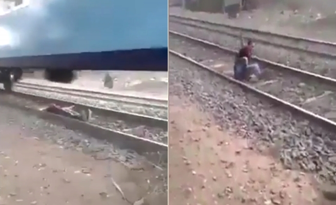 ويظهر الفيديو القطار وهو يسير بسرعة كبيرة، بينما كان الشاب ممددا بين طرفي سكة الحديد في وضعية خطيرة.
