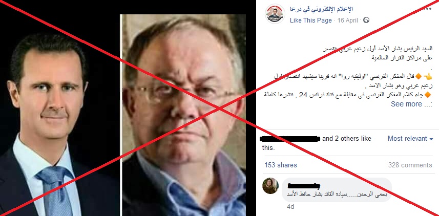 وأرشد البحث على محرّك غوغل باستخدام كلمات مفتاح مثل “Assad” و “Olivier Roy”، وهو باحث متخصص بالشؤون الإسلامية في معهد الجامعة الأوروبية في إيطاليا، إلى مقالات نشرت في مواقع إخباريّة فرنسيّة عدّة عام 2012 تشير إلى أنّ المقابلة المزعومة مُختلقة ولم يدل بها روا لأي وسيلة إعلاميّة.