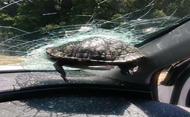 كثيرا ما تصطدم الصخور وغيرها من الحطام بالزجاج الأمامي للمركبات وتجرح سائقا أو راكبا، لكن أن تصطدم سلحفاة، فهو أمر غريب ونادر.