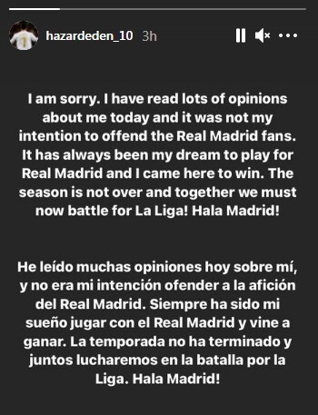 من جهته قدم البلجيكي إدين هازارد اعتذاره لجماهير ريال مدريد الإسباني، وكتب هازارد عبر خاصية “الستوري” بحسابه الشخصي في “إنستغرام”: “أنا آسف جدا. لقد قرأت العديد من الآراء عني اليوم ولم تكن في نيتي الإساءة لجماهير ريال مدريد. كان حلمي دائما اللعب لريال مدريد وجئت إلى هنا للفوز”.