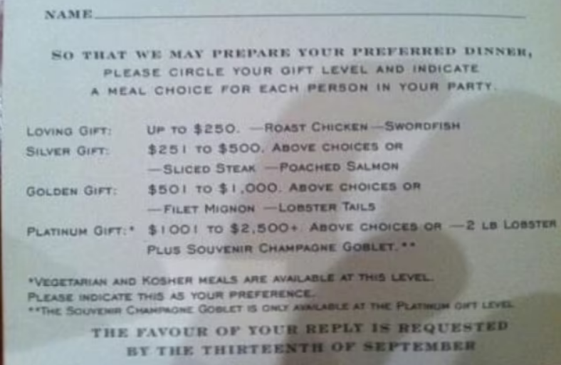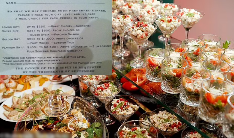 وذكرت بطاقة الدعوة أن أي هدية تقل عن 250 دولارًا تعتبر هدية حب – والضيوف في هذه الفئة سيأكلون الدجاج أو سمك أبو سيف في حفل الاستقبال، أما مقدمو الهدايا الفضية الذين ينفقون ما بين 250 و500 دولار، سيكونون قادرين على الاختيار بين شرائح اللحم أو السلمون المسلوق.