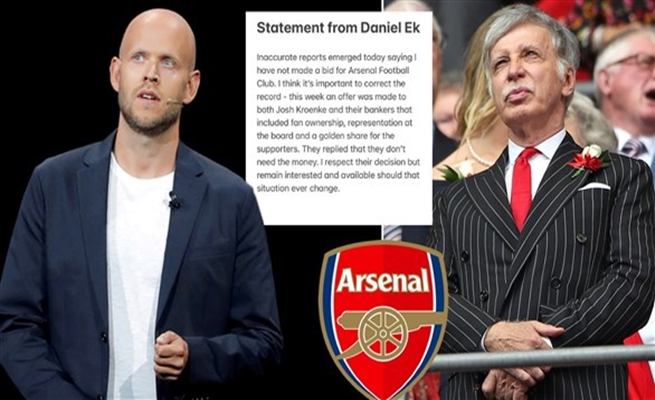 قال الرئيس التنفيذي ومؤسس سبوتيفاي دانييل إيك، إن عرضاً قدمه لشراء آرسنال المنافس في الدوري الإنكليزي الممتاز لكرة القدم، رفضته عائلة ستان كرونكي المالكة للنادي.