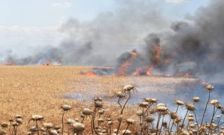 روسيا اليوم : ” وسط بوادر أزمة جديدة .. حريق يلتهم عشرات الدونمات من قمح سوريا “