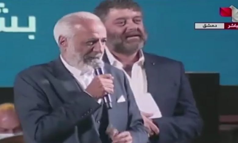 وكان بين الحاضرين الممثل أيمن زيدان الذي زعم أن بشار الأسد هزم الظلام وفتح باب النور لسوريا.