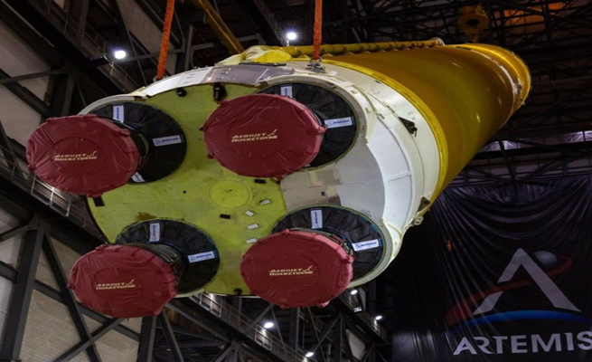 وهذه المرة الأولى التي تُجمع فيها المكونات الثلاثة الأساسية للصاروخ بالشكل الذي ستنطلق به إلى الفضاء.