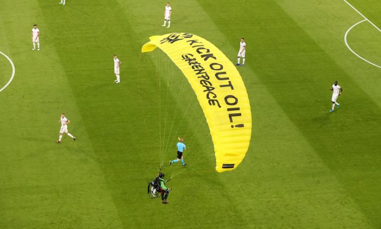قدمت منظمة السلام الأخضر “غرين بيس” اعتذاراً على حسابها الألماني في “تويتر”، وذلك بعد هبوط بمظلة مدفوعة بمحرك، قادها محتج ينتمي إلى المنظمة البيئية العالمية غير الحكومية للاحتجاج ضد شركة “فولكس فاغن” الراعية لبطولة أمم أوروبا، في الملعب الذي يحتضن مباراة ألمانيا مع فرنسا ضمن “يورو 2020″، الثلاثاء، وكاد أن يتسبب في مأساة بعدما قطع أسلاك كاميرا علوية.
