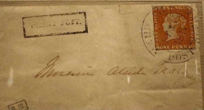 وكان قد تم دفع رسوم البريد لإرسال دعوات إلى حفلة تنكرية لأول مرة بهذا النوع من الطوابع المسمى موريشيوس الأحمر، ويقال إن ثلاثة مظاريف تحتوي على هذا الطابع هي المتبقية منه حتى الآن.