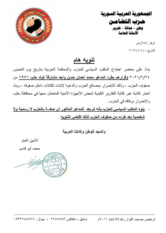 وأعلن الحزب في قراره طرد العضو محمد نعمان حسن واجد بتهمة الإضرار بمصالح الحزب، والدعوة لإنشاء تكتلات داخل صفوفه، وبثّ أخبار كاذبة عبر كتابة تقارير كيدية لبعض الأجهزة الأمنية المتعامل معها في محافظة حلب، والإضرار برفاقه في الحزب.