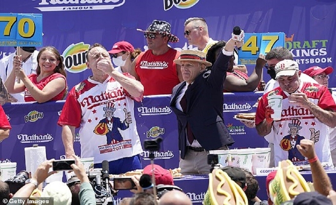 أكل الأمريكي، جوي تشيستانت، 76 هوت دوغ ( وجبة سريعة) بالمسابقة السنوية في 10 دقائق محطما بذلك رقما قياسيا عالميا.