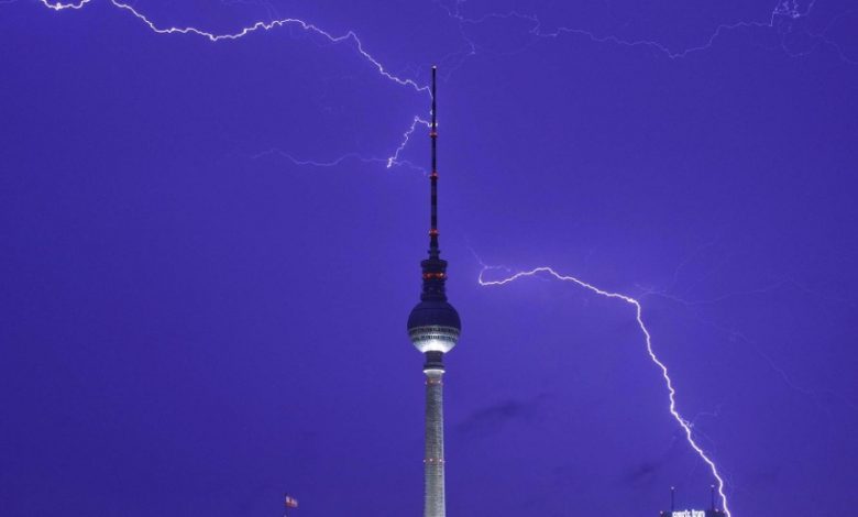 رصدت كاميرات المراقبة في العاصمة الألمانية برلين لحظة ظهور صاعقة برق كبيرة، ضربت برج التلفزيون.