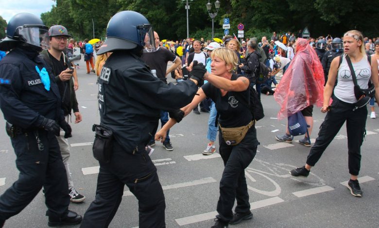 وقالت الشرطة إنّ بعض المتظاهرين “ضايقوا وهاجموا” عددًا من عناصرها في حيّ “شارلوتنبورغ”، غربي العاصمة الألمانيّة، وتجاهلوا حواجز الطُرق في المدينة، وكتبت شرطة برلين على “تويتر”: “حاولوا تجاوز جهاز الشرطة بالقوّة.. أدّى ذلك إلى استخدام الغاز والهراوات والعنف الجسدي”، مشيرةً إلى اعتقال كثير من الأشخاص.