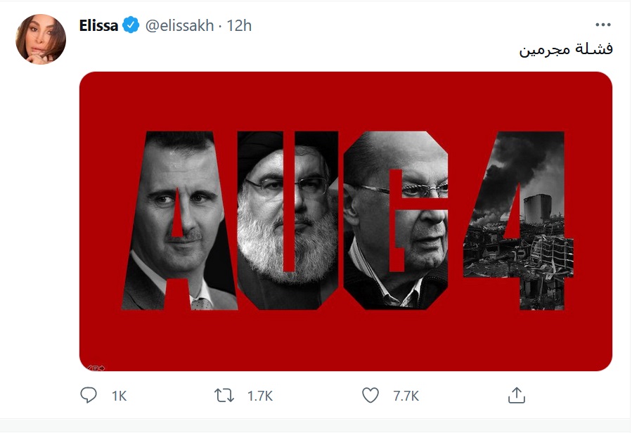 وأضافت: “نشرت إليسا على صفحتها عبر تويتر صورة جمعت كل من رئيس الجمهور ميشال عون، السيد حسن نصر الله، والرئيس السوري بشار الأسد، واصفةّ إياهم بـ (فشلة مجرمين)”.