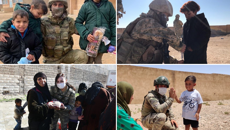 وأرفقت الوزارة في منشورها على “تويتر” صورا للمساعدات المقدمة للأطفال في مناطق عمل القوات المسلحة التركية. (ANADOLU)