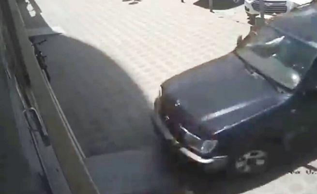 وظهرت في الفيديو سيارة تستعد للتوقف أمام أحد المحلات إلا أنها اندفعت بشكل مفاجئ نحو المحل المقابل فحطمت واجهته الزجاجية.