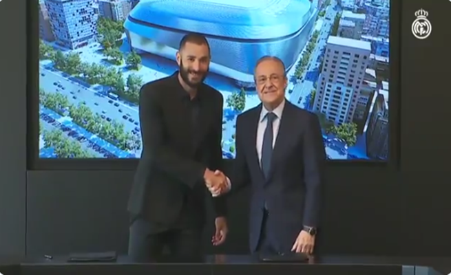 ونشر ريال في صفحته على موقعه الرسمي “تويتر” صورة تجمع بين رئيس النادي فلورنتينو بيريس وبنزيمة يحملان قميصا كتب عليه “بنزيمة 2023”.