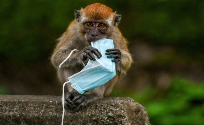 وتعد القرود من الحيوانات التي يمكنها تقليد البشر بطريقة ساخرة في العديد من الأمور ومنها استخدام أقنعة الوجه الخاصة بمكافحة فيروس كورونا.