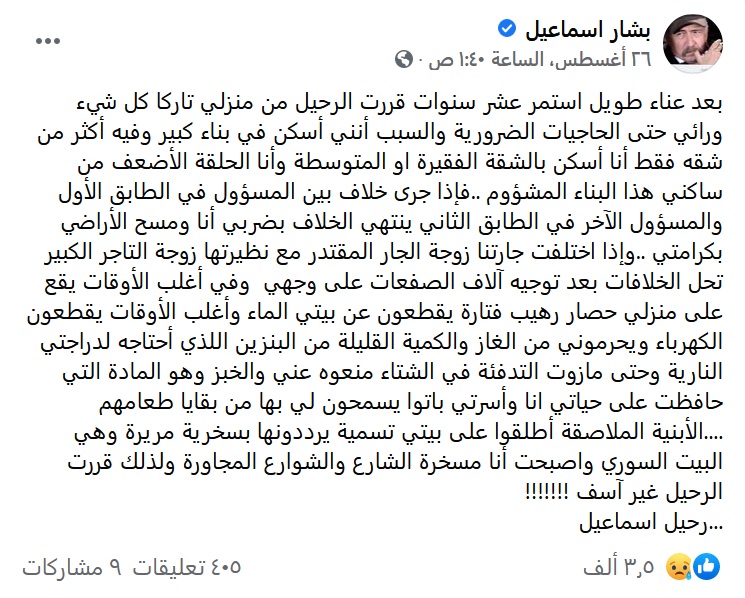 وكتب اسماعيل: “بعد عناء طويل استمر عشر سنوات قررت الرحيل من منزلي تاركا كل شيء ورائي حتى الحاجيات الضرورية”.