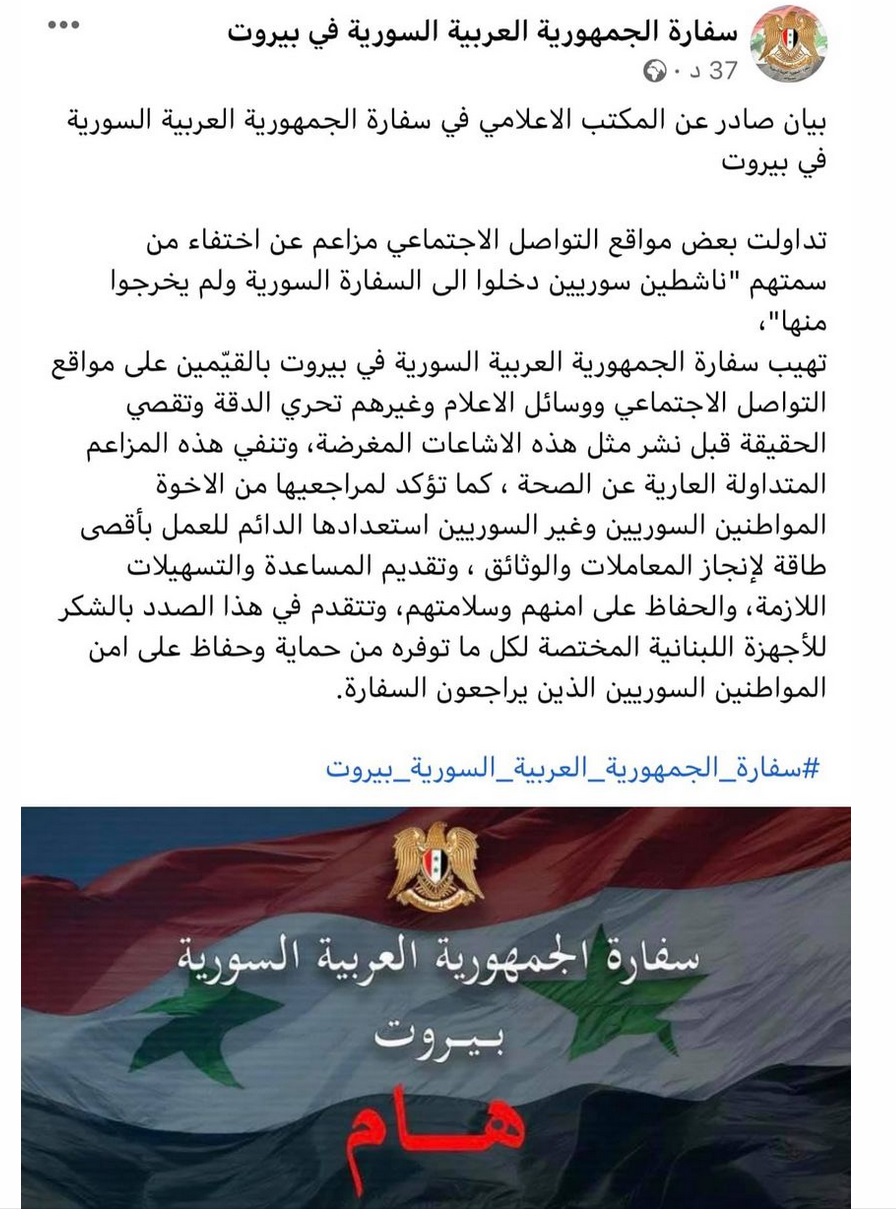 قال ناشطون سوريون ومصادر إعلامية لبنانية، إن سوريين اختطفوا من أمام مبنى “السفارة السورية” في لبنان، ليلي ذلك بيان من الجيش اللبناني يفيد باعتقالهم.