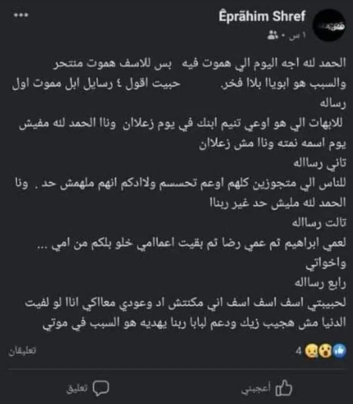 وقد طالب في منشوره الأخير على “فيسبوك” الآباء بـ”معاملة أبنائهم معاملة حسنة”، متهماً والده بالتسبب في وفاته ودفعه إلى الموت منتحراً. وكما طالب أعمامه برعاية والدته وأشقائه.