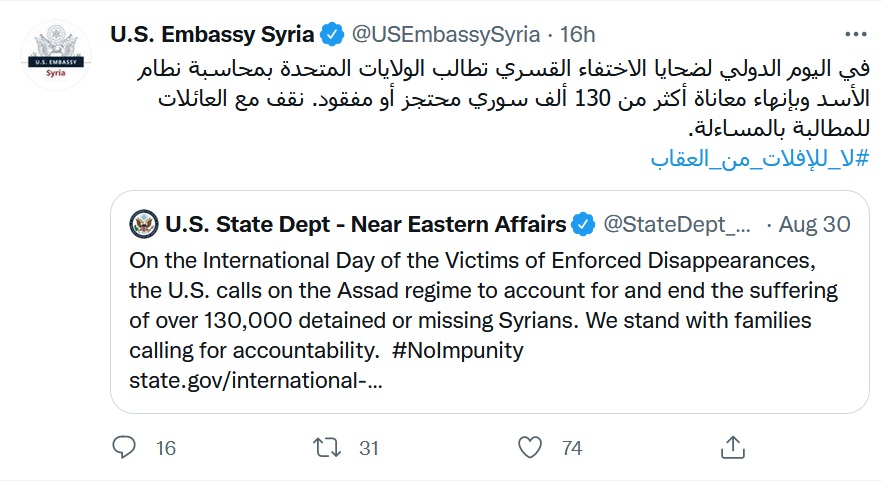 قالت سفارة الولايات المتحدة الأمريكية في سوريا، إن الولايات المتحدة تطالب بمحاسبة نظام الأسد وإنهاء معاناة أكثر من 130 ألف سوري محتجز أو مفقود.