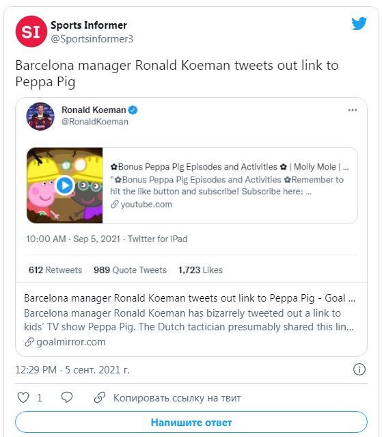 نشر الهولندي رونالد كومان، المدير الفني لفريق برشلونة الإسباني لكرة القدم، الأحد، عن طريق الخطأ حلقة من مسلسل الرسوم المتحركة الشهير “Peppa Pig” عبر حسابه على موقع “تويتر”.