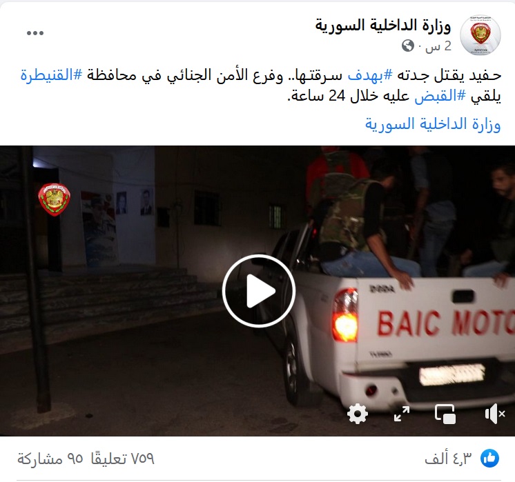 وقالت وزارة الداخلية النظامية في بيان: “تم إعلامنا من قبل غرفة عمليات محافظة القنيطرة بوجود جثة امرأة طاعنة في السن مرمية ضمن الجورة الفنية الصحية الخاصة بمنزلها بقرية مجلولية بريف القنيطرة وتدعى وفاء”.