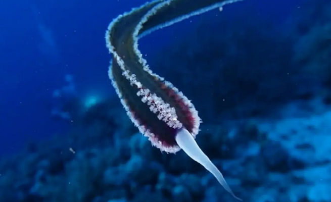 ظهر كائن حي غريب، وجديد على ما يبدو وغامض تماما، بلا عينين ولا فم وأذنين، فصعق له الغواصون الأجانب حين رأوه في الجانب المصري من البحر الأحمر قبل أسبوع، وصفه واحد منهم لصحيفة بريطانية، بأنه “شبيه بأنبوب مطاطي طويل ومربع، نهايته مدببة” كما قال.