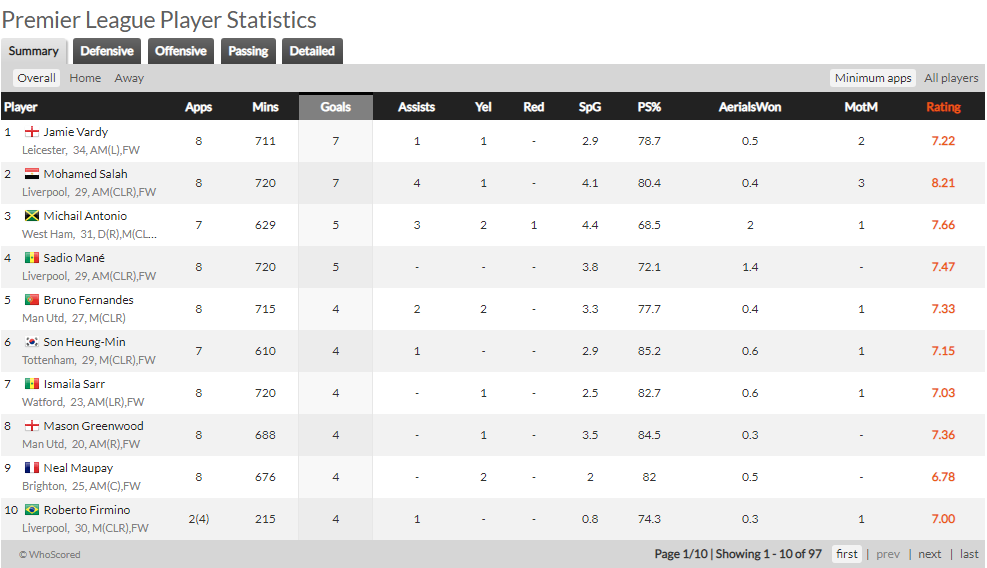 أسدل الستار على منافسات الجولة الثامنة في الدوري الإنكليزي الممتاز، وما زال الصراع على صدارة ترتيب هدافي المسابقة مستمراً بين محمد صلاح مهاجم ليفربول، وجيمي فاردي مهاجم ليستر سيتي.