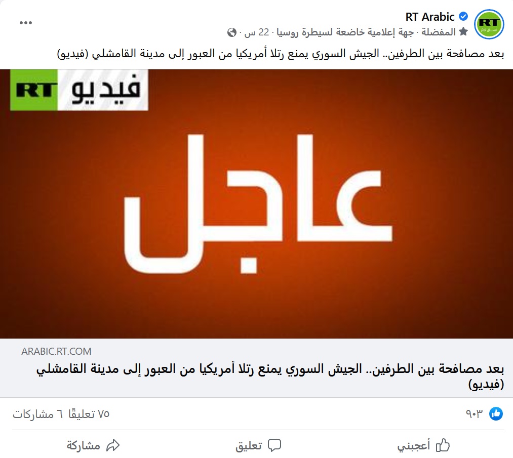 قالت قناة “روسيا اليوم” الروسية، الجمعة، في خبر بعنوان “بعد مصافحة بين الطرفين.. الجيش السوري يمنع رتلا أمريكيا من العبور إلى مدينة القامشلي” إن “قوات الجيش السوري المتمركزة في مدخل القامشلي الغربي على الطريق الدولي M4 رتلا أمريكيا من العبور إلى مدينة القامشلي وأجبره على التراجع”.
