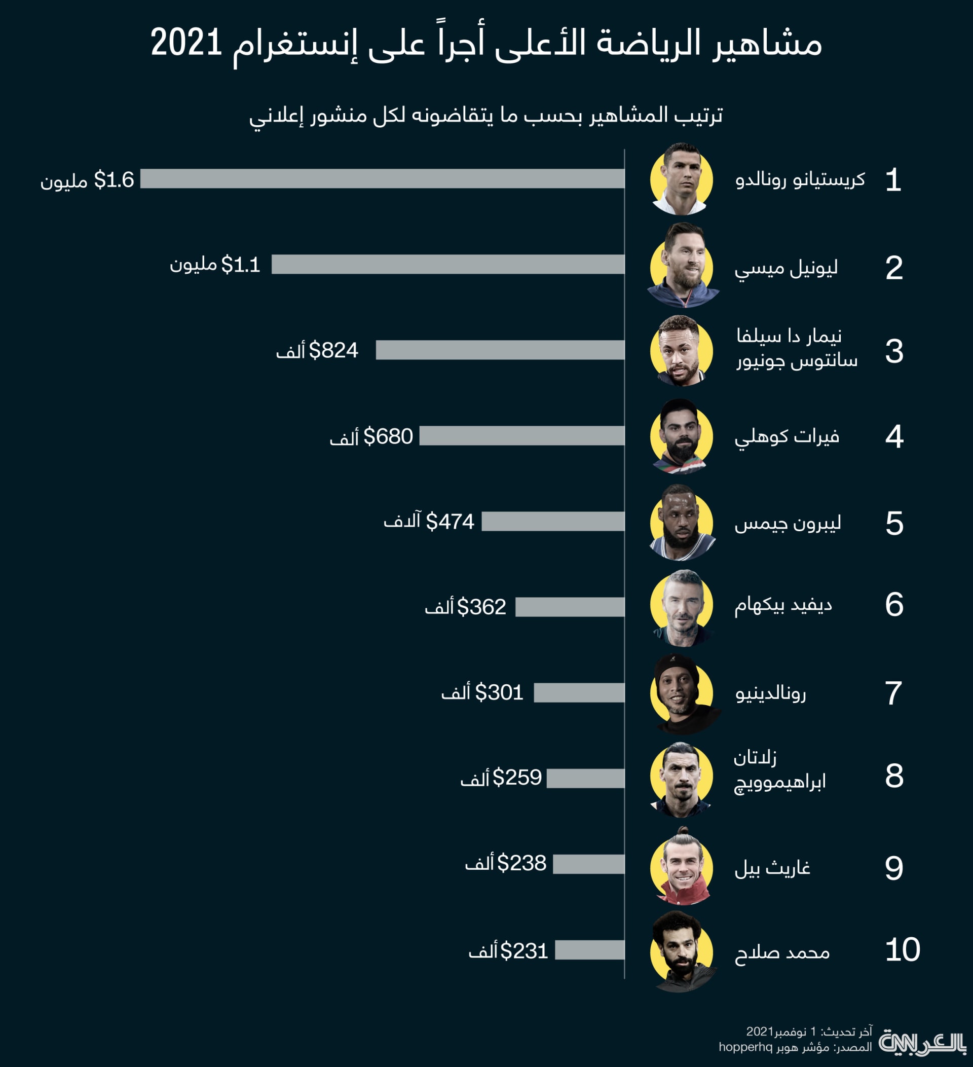 نعرض لكم في الانفوغرافيك نظرة مفصلة على تصنيف أغنى 10 مؤثرين رياضيين على منصة إنستغرام لعام 2021، وفق ما اوردت شبكة “سي إن إن”: