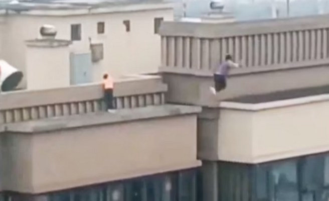 كما، أظهر مقطع الفيديو، الذي تم تصويره في 24 أكتوبر الفائت، أحد الصبية يقفز بشكل متكرر بين حافتي المبنى.