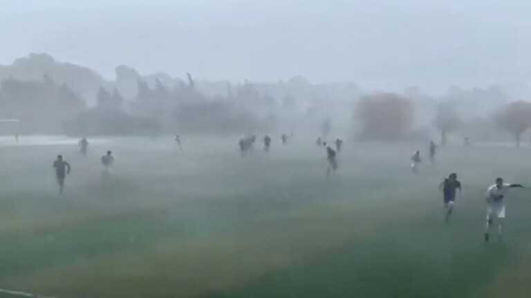 وانتشر مقطع فيديو على موقع التواصل الاجتماعي “فيسبوك” يظهر خروج اللاعبين من اللعب تحت المطر والرياح العاتية.