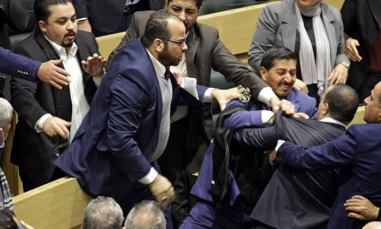 جانب من العراك الذي شهده البرلمان الأردني خلال ” مناقشة تعديلات دستورية ” ( فيديو )