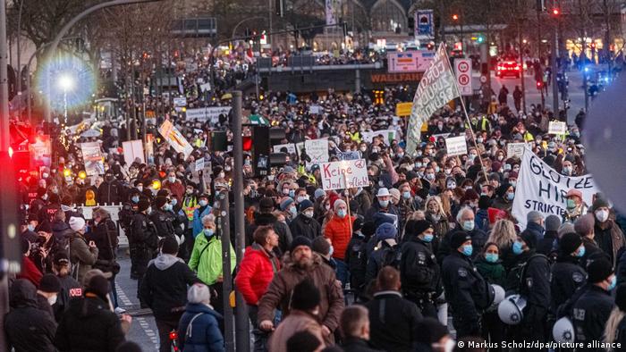 وشهدت مدن ألمانية احتجاجات بشكل منتظم خلال أيام الاثنين على مدار الأسابيع الماضية، ضد القيود الاجتماعية وقواعد التطعيم ضد الفيروس، حيث شددت ألمانيا موقفها من غير الملقحين وحظرت دخولهم المطاعم وأماكن الأنشطة التجارية غير الأساسية وغيرها من الأماكن .
