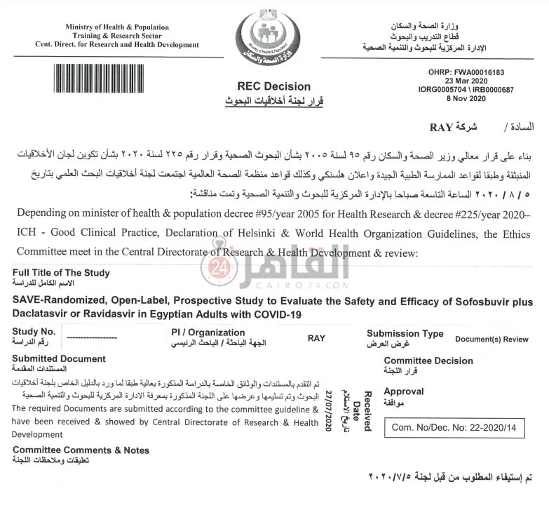 نشر موقع “القاهرة 24″، مستند موافقة وزارة الصحة المصرية على استخدام بروتوكول صحي محدد لإجراء تجارب سريرية تتضمن استخدام عقار السوفالدي على مرضى فيروس كورونا.