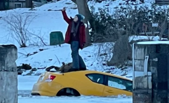 وأظهرت مقاطع فيديو انتشرت على مواقع التواصل الاجتماعي، سيارة الشابة وهي تغرق بشكل تدريجي في البركة الجليدية، بينما صعدت الشابة الكندية إلى سطحها وتطلب النجدة.