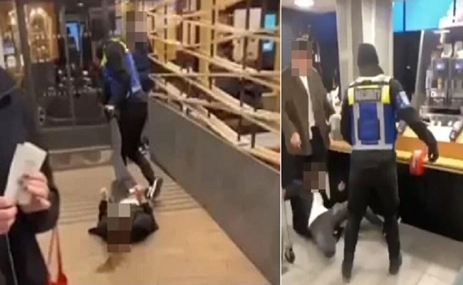 وثق مقطع فيديو صادم، لحظة توجيه حارس أمن بمطعم “ماكدونالدز” الشهير لكمة لوجه زبونة أردتها أرضا، ثم سحلها إلى خارج المحل.