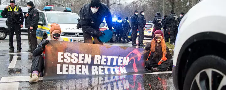 وتحت شعار “أنقذوا الطعام – أنقذوا الأرواح”، احتل النشطاء مداخل ومخارج طريق “بروسل شتراسه” في غرب المدينة، بحسب مراسل وكالة الأنباء الألمانية (د.ب.أ) في موقع الاحتجاج، وبعد ذلك، تحركوا لإغلاق الطريق السريع رقم 100 أيضاً، ما تسبب في تعطل حركة المرور.