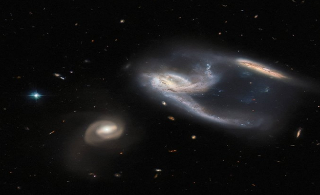 ووفقاً لقناة “سكاي نيوز”، تحدث التفاعلات بين المجرات على فترات زمنية طويلة جدًا، ونادراً ما تصطدم مع بعضها البعض، كما أنه من غير الواضح ما إذا كانت المجرة الموجودة في أسفل اليسار تتفاعل مع المجرتين الأخريين، على الرغم من قربهما نسبيًا.