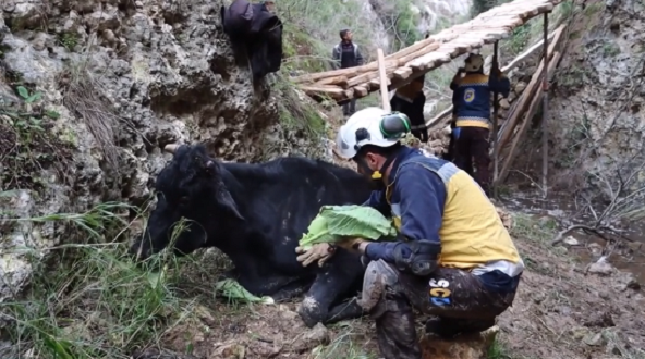 في إدلب .. الدفاع المدني ينقذ بقرة سقطت في واد عميق ( فيديو )