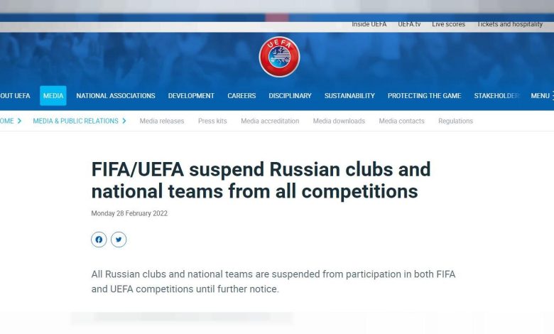 وجاء في البيان المشترك “قرر كل من الاتحاد الدولي والاوروبي معا الاثنين استبعاد جميع المنتخبات الروسية أكان على الصعيد الوطني أو الأندية من المشاركة في جميع مسابقات فيفا وويفا حتى اشعار آخر”.