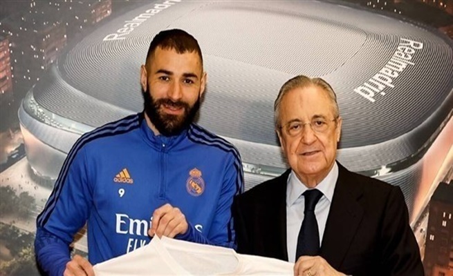 أهدى رئيس نادي ريال مدريد، فلورنتينو بيريز، الجمعة، قميصاً تذكارياً للاعب الفرنسي كريم بنزيما بعد تسجيله ثلاثة أهداف يوم الأربعاء الماضي، في شباك باريس سان جيرمان، متخطياً بذلك ألفريدو دي ستيفانو (308 أهداف) في قائمة الهدافين التاريخيين للنادي، ومسجلاً 309 أهداف.