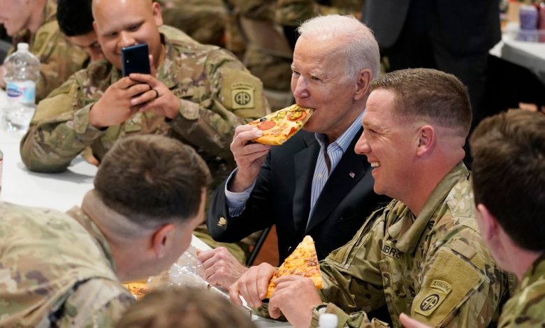بايدن يتناول البيتزا مع القوات الأمريكية في بولندا ( فيديو )