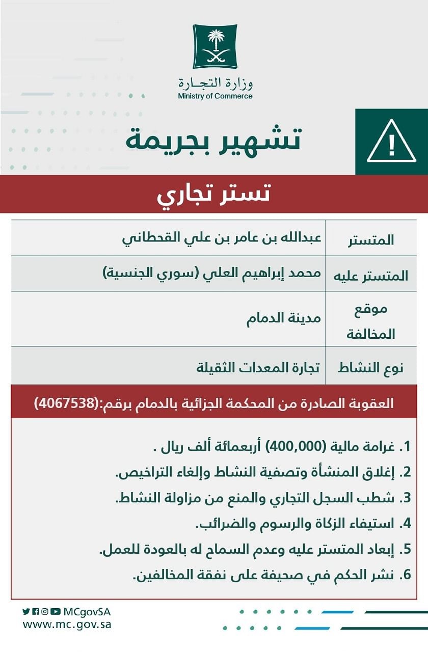 قالت وسائل إعلام سعودية، إن وزارة التجارة السعودية شهرت بمواطن سعودي ومقيم سوري الجنسية، بعد صدور حكم قضائي يُدينهما بارتكاب جريمة التستر في تجارة المعدات الثقيلة بمدينة الدمام.