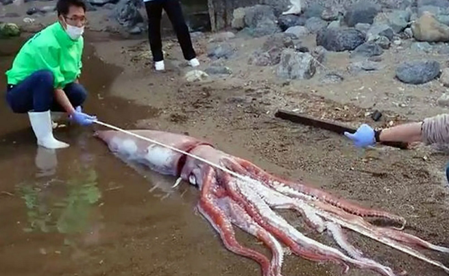 العثور على حبار عملاق غريب الشكل في اليابان