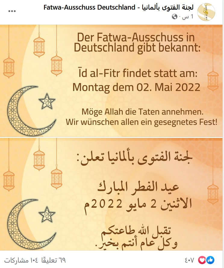 أعلنت لجنة الفتوى في ألمانيا عن موعد حلول عيد الفطر.