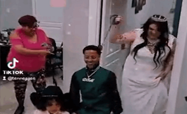 وظهر أفراد أسرة العريسين وهم يهتفون للزوجين ويرقصون بحماس حولهم أثناء القيام بهذا الدخول، كما شوهد صبي يرتدي بدلة كريمية وقبعة رعاة البقر يتجول حول الزوجين مبتسمين.